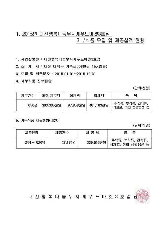19-03-28 11:27 대전행복나눔무지개푸드마켓3호점 2015년 기부식품 모집 및 제공실적 현황 페이지 정보 작성자 성우보육원 댓글 0건 조회 7,277회 본문 2015년 기부식품 모집 및 제공실적 현황 목록 댓글목록 댓글목록 등록된 댓글이 없습니다.