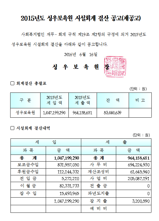 19-03-28 11:31 (재공고)2015년 시설회계 결산 페이지 정보 작성자 성우보육원 댓글 0건 조회 7,660회 본문 (재공고)2015년 시설회계 결산 목록 댓글목록 댓글목록 등록된 댓글이 없습니다.