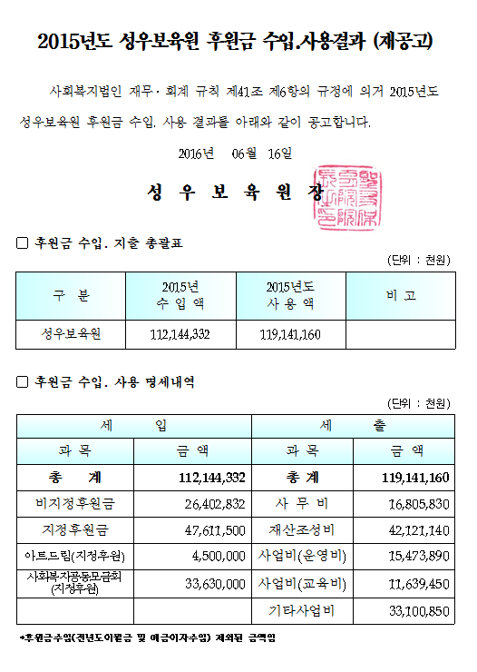 19-03-28 11:31 (재공고) 2015년 후원금 수입 및 지출명세서 페이지 정보 작성자 성우보육원 댓글 0건 조회 7,671회 본문 2015년 후원금 수입 및 지출명세서 목록 댓글목록 댓글목록 등록된 댓글이 없습니다.