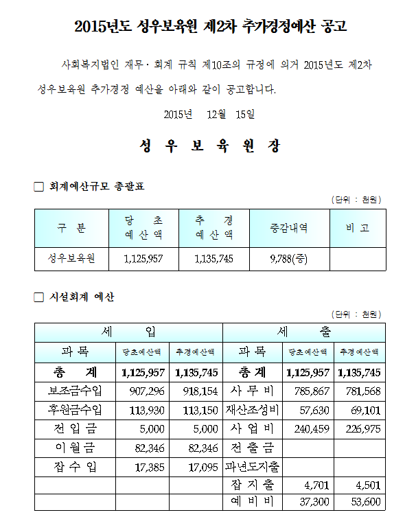 19-03-28 11:24 2015년 성우보육원 제2차 추가경정 예산공고 페이지 정보 작성자 성우보육원 댓글 0건 조회 6,596회 본문 2015년 성우보육원 제2차 추가경정 예산공고 목록 댓글목록 댓글목록 등록된 댓글이 없습니다.