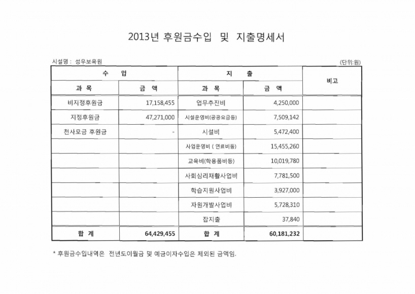 19-03-28 10:59 <공고>2013년 후원금 수입 및 지출명세서 페이지 정보 작성자 성우보육원 댓글 0건 조회 7,844회 본문 2013년 후원금 수입 및 지출명세서 목록 댓글목록 댓글목록 등록된 댓글이 없습니다.