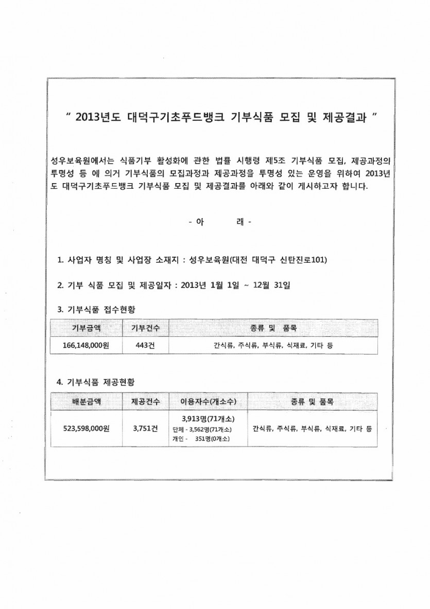 19-03-28 11:00 2013년 대덕구기초푸드뱅크 운영실적(기부식품 모집 및 제공결과) 페이지 정보 작성자 성우보육원 댓글 0건 조회 7,174회 본문 2013년도 대덕구기초푸드뱅크 운영실적(기부식품 모집 및 제공결과)을 게시합니다. 목록 댓글목록 댓글목록 등록된 댓글이 없습니다.