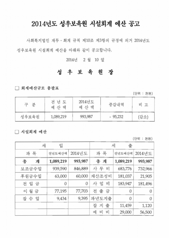 <공고> 2014년 시설회계예산 작성일 19-03-28 10:59 페이지 정보 작성자성우보육원 조회 7,421회 댓글 0건 본문 <공고> 2014년 시설회계예산 댓글목록 댓글목록 등록된 댓글이 없습니다.