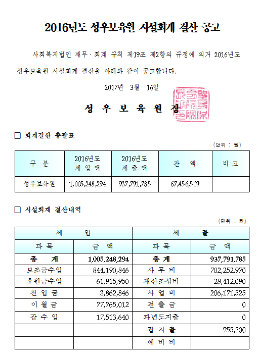 19-03-28 11:37 (공고)2016년 시설회계 결산 페이지 정보 작성자 성우보육원 댓글 0건 조회 7,662회 본문 2016년 시설회계 결산 목록 댓글목록 댓글목록 등록된 댓글이 없습니다.