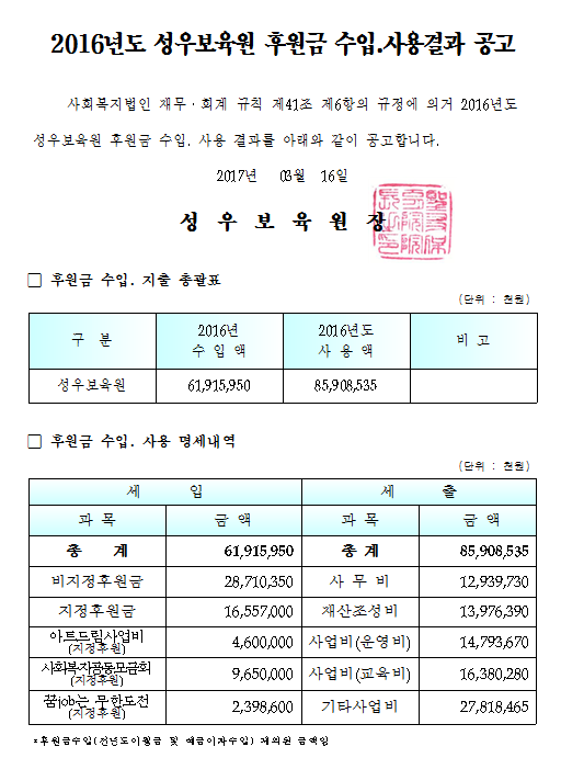 19-03-28 11:37 (공고) 2016년 후원금 수입 및 지출명세서 페이지 정보 작성자 성우보육원 댓글 0건 조회 7,385회 본문 2016년 후원금 수입 및 지출명세서 목록 댓글목록 댓글목록 등록된 댓글이 없습니다.