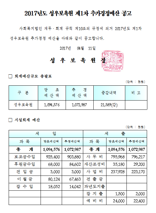 19-03-28 11:38 (공고)2017년 제1차 추가경정 예산 공고 페이지 정보 작성자 성우보육원 댓글 0건 조회 7,182회 본문 2017년 제1차 추가경정 예산 공고 목록 댓글목록 댓글목록 등록된 댓글이 없습니다.