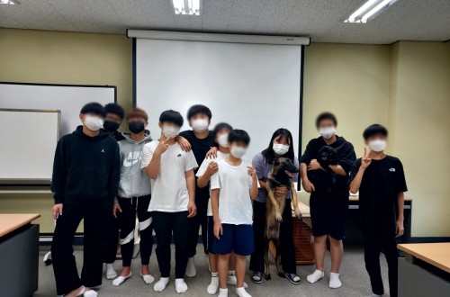 김수민 강사님 내방하셔서 중·고등 남학생 대상 진로(직업체험)프로그램으로 반려견 지도사 프로그램 진…