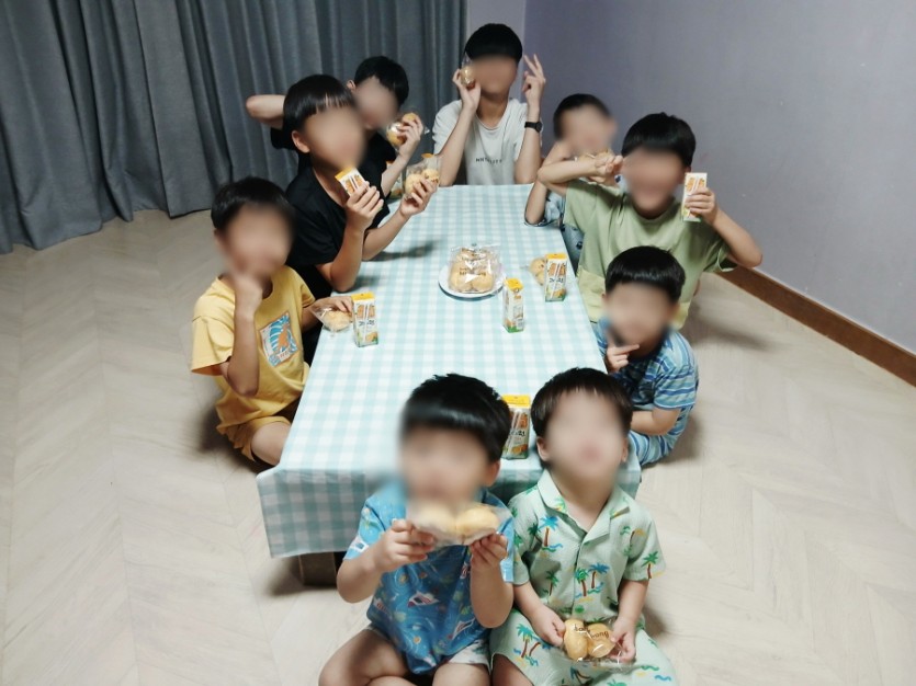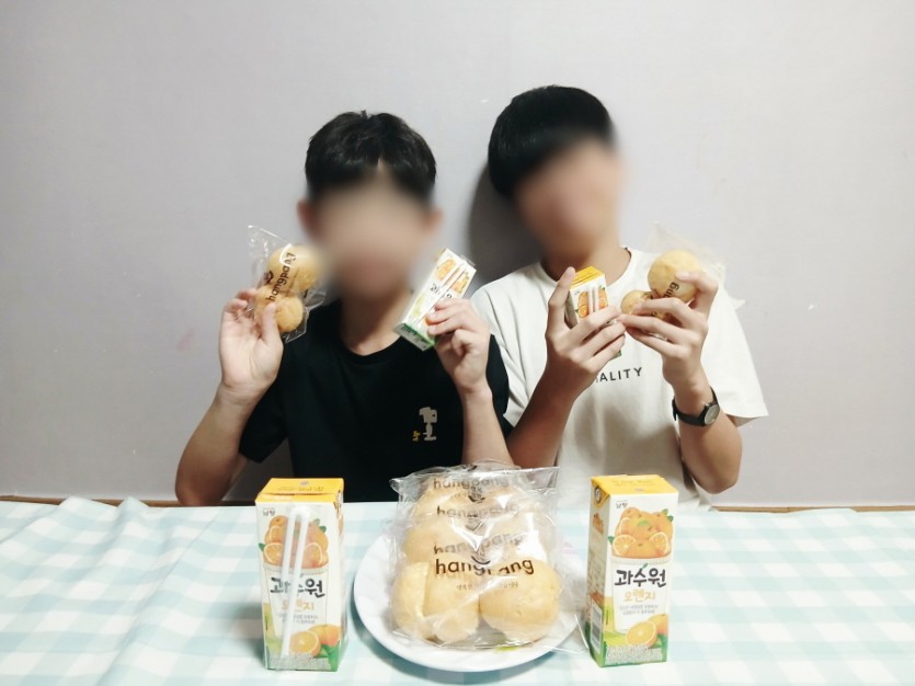 아이들이 모두 빵과 음료를 먹으며, 행복한 간식 시간을 보냈습니다^^
