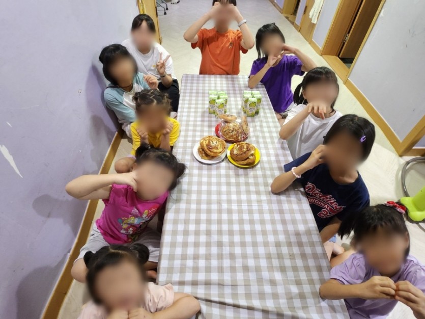 아이들이 간식을 먹으며, 쎄트렉 아이 분들에 대한 감사함과 사랑해 대해 이야기하며,