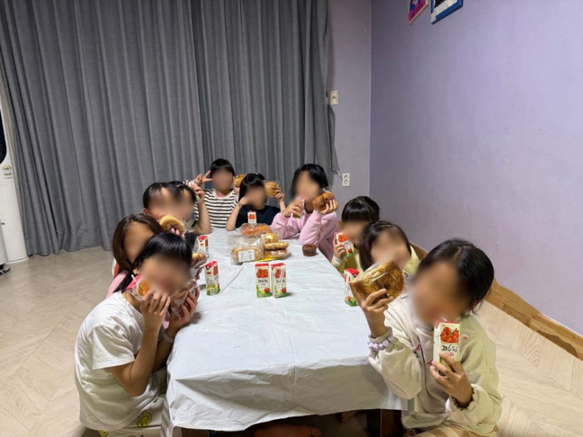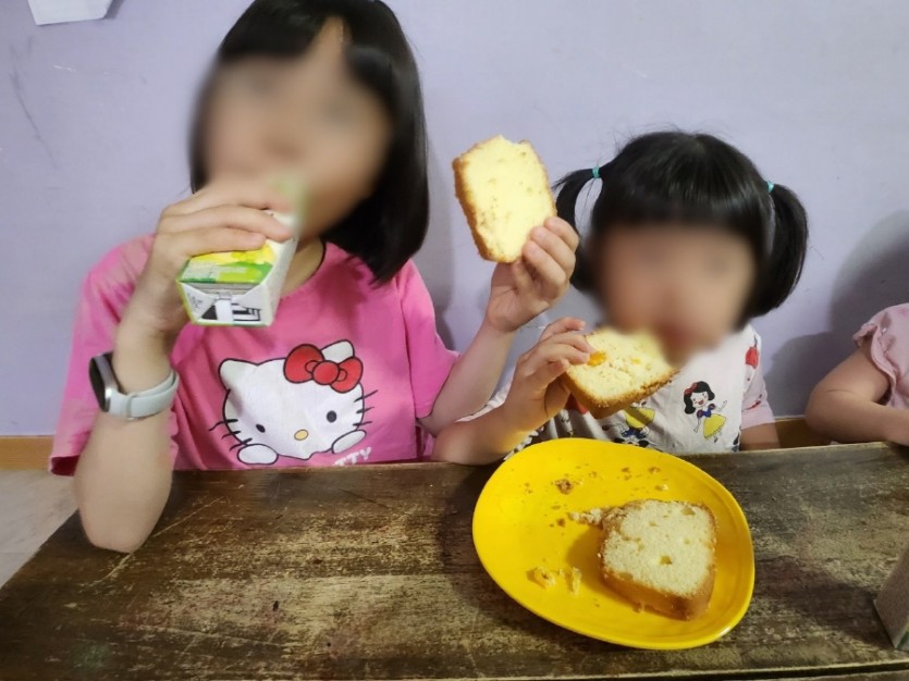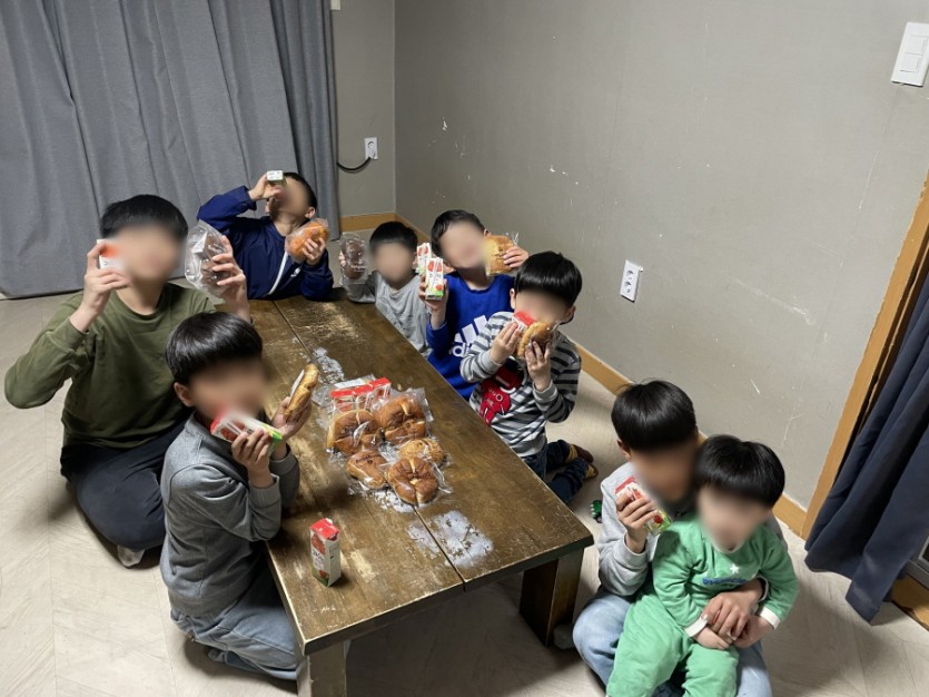 아이들이 간식을 먹으며, 쎄트렉 아이 분들에 사랑에 대해 감사함을 이야기하며,